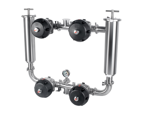 該雙聯過濾器適用于去除鮮奶、糖液、飲料等液體中各桶內肉眼無法看見的固體物的凈化。兩只過濾器交替使用,可不停機更換或洗濾網,適用于長期連續生產。